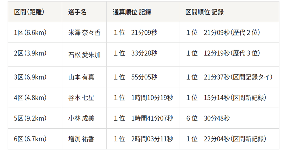 総合タイムは2時間03分11秒で、2位のチームに2分31秒と大差をつけて、1区から一度も首位を譲らない女王のレースで圧倒しました。