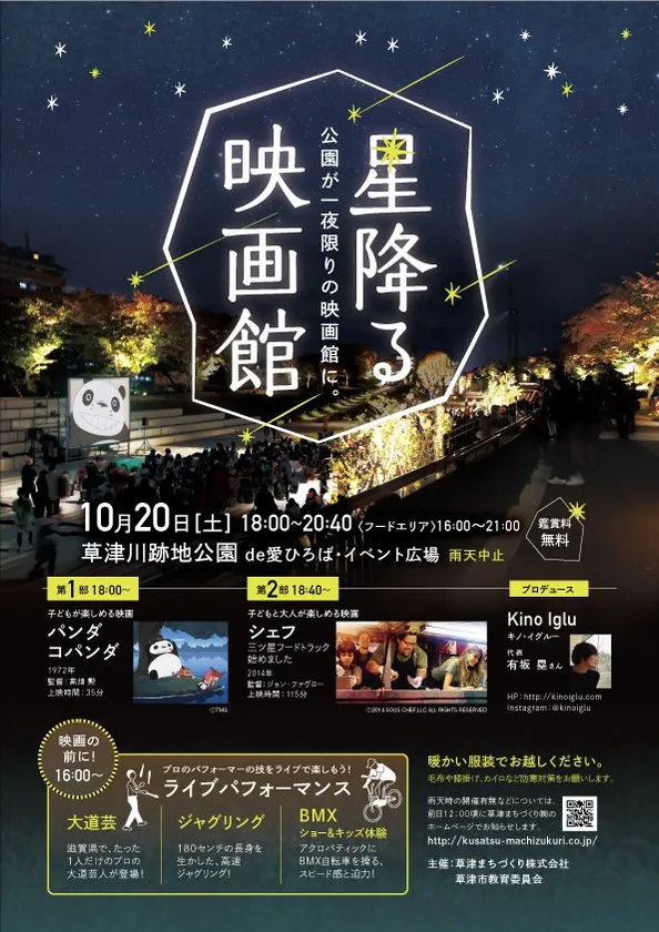 草津まちづくり株式会社(所在地:滋賀県草津市、代表取締役:南 総一郎)は、草津川跡地公園(区間5)において、野外映画上映イベント『星降る映画館』を2018年10月20日(土)に開催します。
