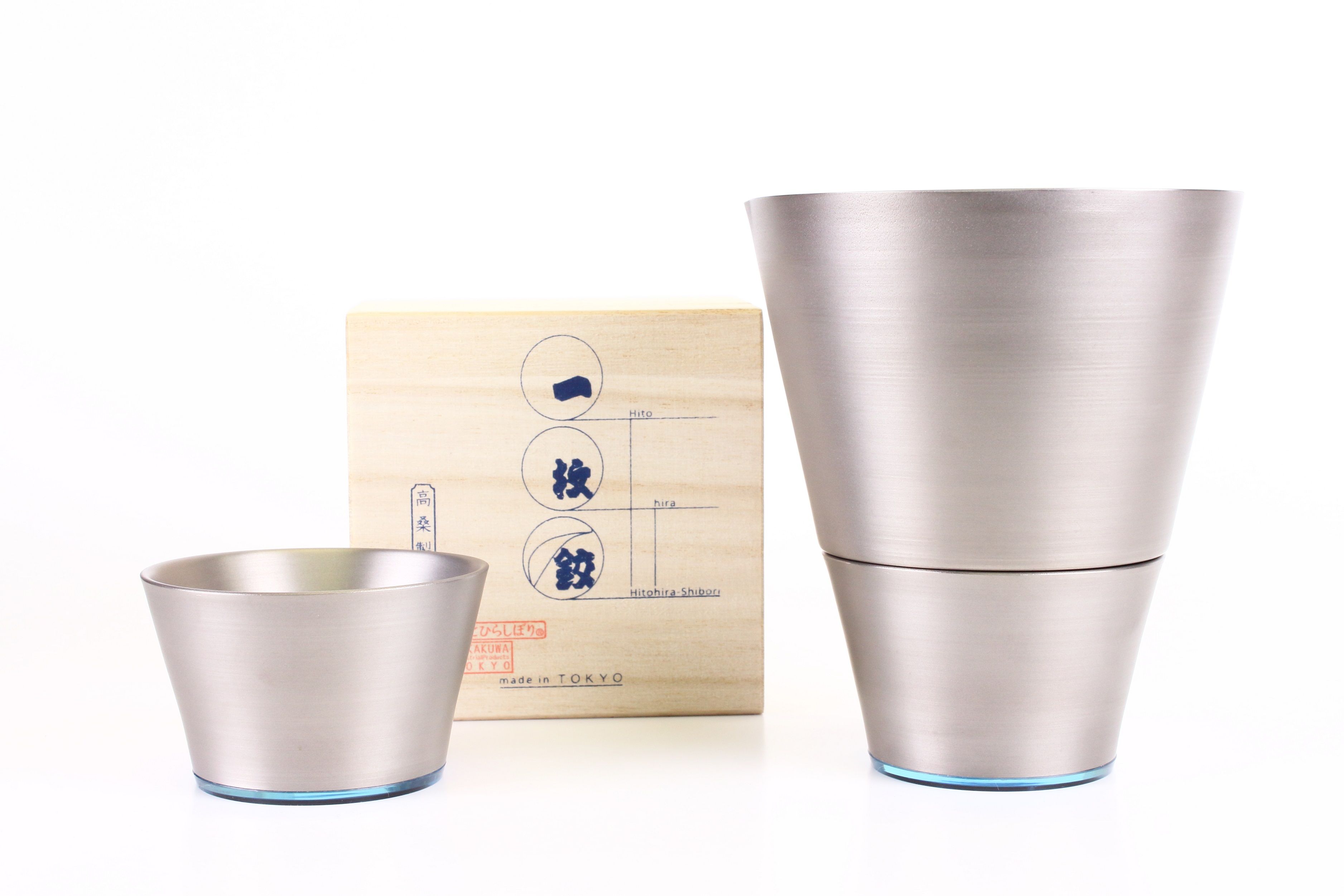 職人技の金属加工「ヘラシボリ」をさらに発展させた特許技術によりつくられます。たった一枚のチタン板から不可能とされていた二重構造の器が成形されています。飾る収納では逆円錐台に重なる「ぐいのみ」と「かたくち」が現代住空間に美しく馴染みます。使用時手元では見た目も感触も丸い寛ぎのアイテム。