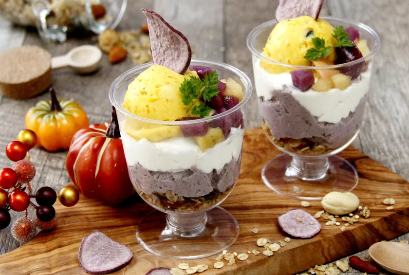 なめらかで濃厚なかぼちゃのジェラートと甘酸っぱい「ノニ酵素」入りのベリーヨーグルトムースのパルフェ。タヒチアンノニ カフェ オリジナルのグラノーラや、豆乳のホイップも入っているため、丸ごとカラダにやさしいメニューとなります。甘さ控えめのムラサキ芋とシャキシャキしたリンゴのコンポートを添えています。すべての層で食感が違うため、各層ごとに食べても、一緒に食べても飽きずに美味しく召し上がれます。付け合わせのムラサキ芋のチップスもお楽しみください。