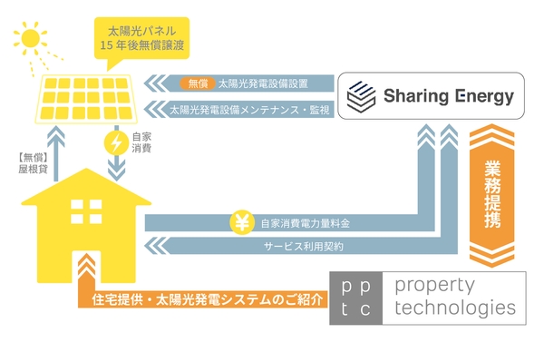 株式会社property technologies(以下「当社」)は、太陽光発電システムの第三者所有(PPA)サービス「シェアでんき」を提供する株式会社シェアリングエネルギー(以下「シェアリングエネルギー」)と業務提携における基本合意をしました。これにより、当社グループ各社の戸建住宅へ、初期費用0円で屋根置き太陽光発電設備を設置し日中の電気料金を削減できるサービスを2023年4月を目途に開始します。