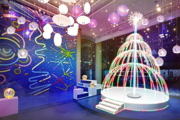 花火クリスマスツリーは、開いた花火の形をした装飾を積み重ねています。今回は4段に積み重ね、前回の高さ3メートルから、6メートルにパワーアップして登場。イルミネーションが施されており、クリスマスらしい赤や緑など、さまざまな色で光ります。花火が打ち上がる瞬間を表現した光の演出は、思わず時間を忘れて眺めてしまう美しさです。さらに、ツリーの中には人が入ることができ、花火に包まれたような気分を味わえます。光り輝く幻想的なツリーの中で過ごしたり、少し離れたところから高さ6メートルのツリーの様子を眺めたり、思い思いに楽しむことができます。