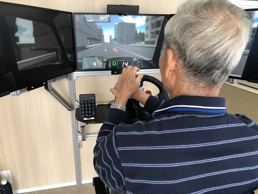 モニター画面の前に簡易的なハンドル・アクセルペダル・ブレーキペダルを設置し、映し出された映像の疑似市街地を自動車で運転走行中に、事故の原因と考えられる場面を作りだし、危険への感受性や認知・判断機能の低下、悪い運転習慣などの運転技術や能力を短時間で診断し、体験者一人ひとりにあった安全運転のアドバイスを提供できる教育機器です。