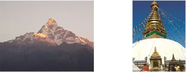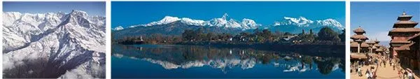 (左)遊覧飛行からのエベレスト※(中央)ペワ湖からみたヒマラヤ山脈(右)ダルバール広場