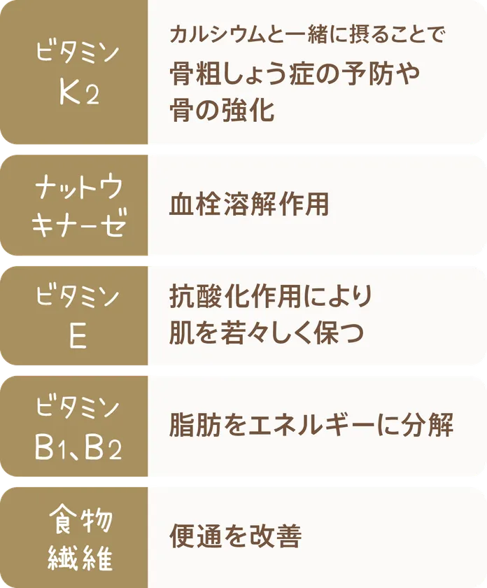 カルシウムと一緒に摂ることで、女性が気になる骨粗しょう症の予防や骨の強化に役立つ「ビタミンK2」をはじめ、抗酸化作用により肌を若々しく保つ「ビタミンE」、脂肪をエネルギーに分解することからダイエットにも役立つ「ビタミンB1やB2」など、美と健康をサポートする納豆の健康成分をご紹介しています。