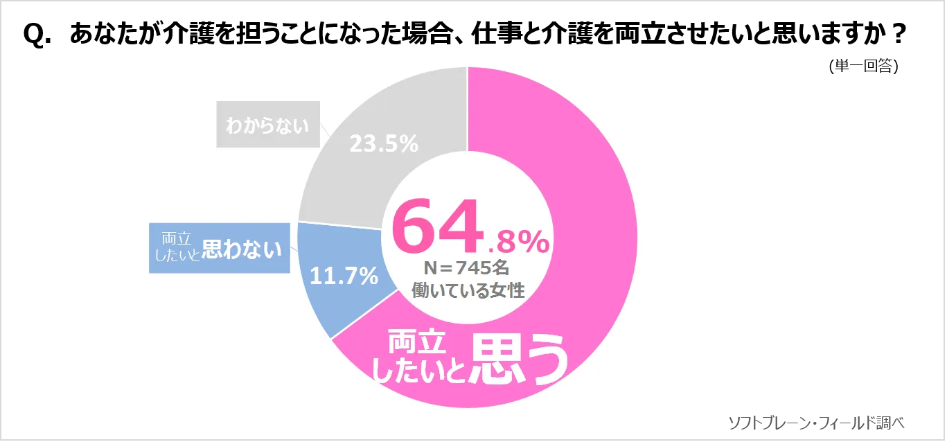 アンケートでは最初に、働く女性全員(n=745名)を対象に、介護(※)を担うようになった場合に、仕事と介護の両立について調査をしました。