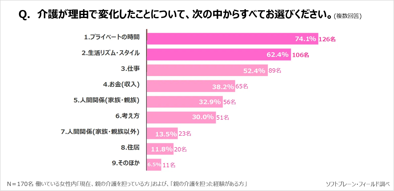 介護が理由で変化したことについては、「プライベートの時間」が74.1%、「生活リズム・スタイル」が62.4%と続き、「仕事」の52.4%を上回る結果となりました。