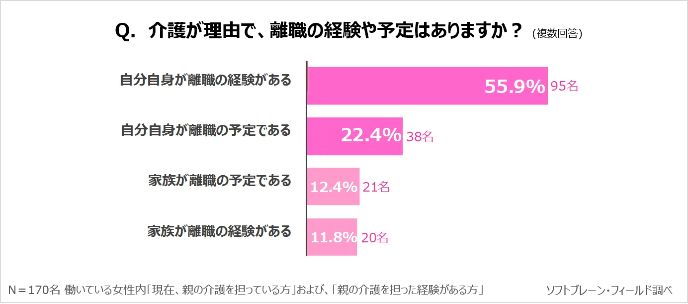 ・「現在、親の介護を担っている方」および、「親の介護を担った経験がある方」(n=170名)を対象に介護が理由で変化したことは、「プライベートの時間」が74.1%、「生活リズム・スタイル」が62.4%と続き、「仕事」の52.4%を上回る結果となった。また、介護が理由で、「自分自身が離職の経験がある」が半数を超え55.9%、「自分自身が離職の予定である」が22.4%となった。