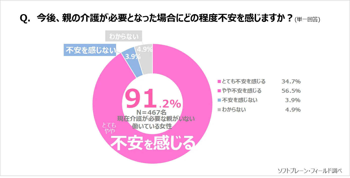・「現在、介護が必要な親はいない」方(n=467名)を対象に、親の介護が必要となった場合に、約9割以上の方が「不安を感じる」と回答。