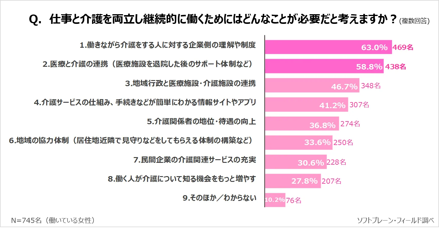 ・仕事と介護を両立し継続的に働くためには、「働きながら介護をする人に対する企業側の理解や制度」が63.0%でもっとも多く、「医療と介護の連携」が58.8%、「地域行政と医療施設・介護施設の連携」が46.7%と続く。