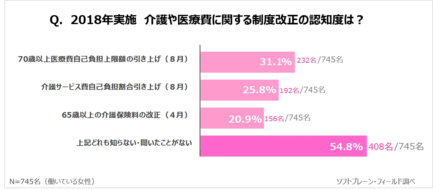 最後に、2018年は4月に実施された「65歳以上の介護保険料の改正」を始め、様々な介護や医療費に関する制度改正が行われました。それぞれの認知度について調査をします。