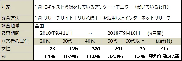 アンケートの対象は、当社に登録するキャスト会員で、有効回答数は745 名(平均年齢47歳・親の介護が身近になる40代~50代がボリュームゾーン)、実施期間は2018年9月11日~9月18日です。(調査概要は、6ページに記載)
