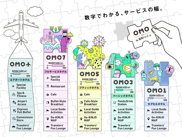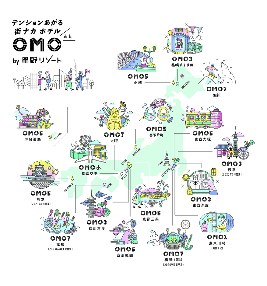 「OMO」は星野リゾートが全国に展開する街ナカホテルブランドです。ブランドコンセプトは「テンションあがる『街ナカ』ホテル」。地域と一体となって街を楽しみ尽くす旅を追求しています。全てのOMOで、街歩きをサポートするGo-KINJO(ごーきんじょ)サービスを展開。