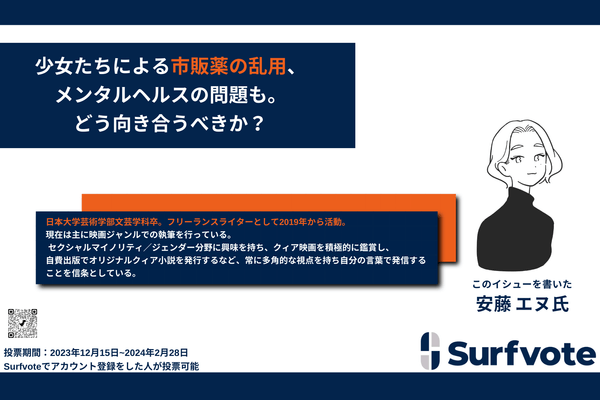 ODの原因として、鬱屈とした心を晴らすために薬物に頼ってしまう、つまりメンタルヘルスの問題に直結していると安藤氏は指摘します。市販薬はドラッグストアで安易に手に入る一方で、乱用すれば死に至るほどの危険もはらんでいます。このオーバードーズ問題について、大人や社会はどのように向き合っていくことが望ましいのか?Surfvoteでひろく意見を集めます。
