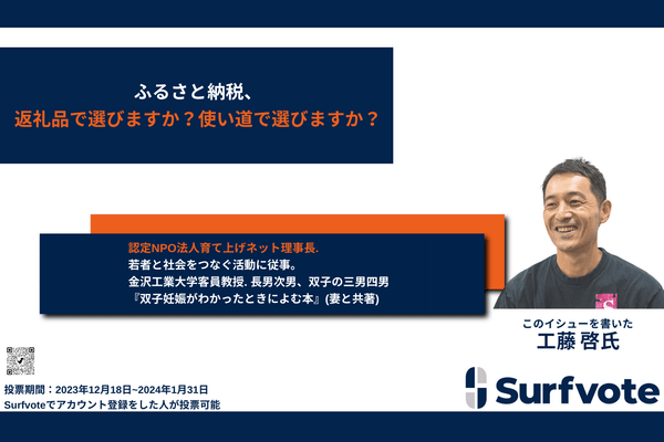 毎年12月は「駆け込みふるさと納税」が急増する時期、ふるさと納税利用者のおよそ8割が12月に集中すると言われています。2022年度のデータでは、受け入れ金額は約9654億円と、一兆円に迫る勢いになっています。各自治体も魅力的な返礼品をラインナップ、普段はなかなか手を出しづらい高級食材などが特に人気です。なにかと「返礼品」ばかりが注目されがちなふるさと納税ですが、昨今注目を浴びているのが「使い道」で選んで寄付をする、ガバメントクラウドファウンディングです。自治体が抱える課題と解決策を提示し、ふるさと納税で寄付を募る仕組み。芸術文化を守る、産業復興や動物愛護など「使い道」は多様化しています。これらを踏まえ、ふるさと納税は「返礼品」で選ぶか?「使い道」で選ぶか?Surfvoteでひろく意見を集めます。