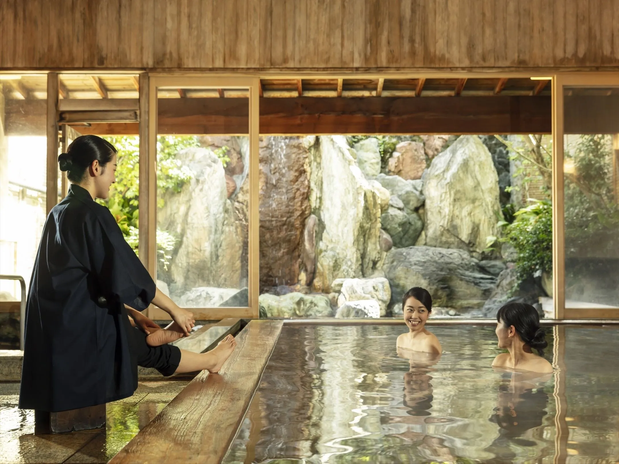 「湯守りタイム」では、大浴場内で半纏(はんてん)姿の界の湯守りが、入浴中の簡単なストレッチ方法や入浴時のポイントを伝えます。また、水分補給用の飲み物を手渡し、快適な入浴の手伝いをします。
