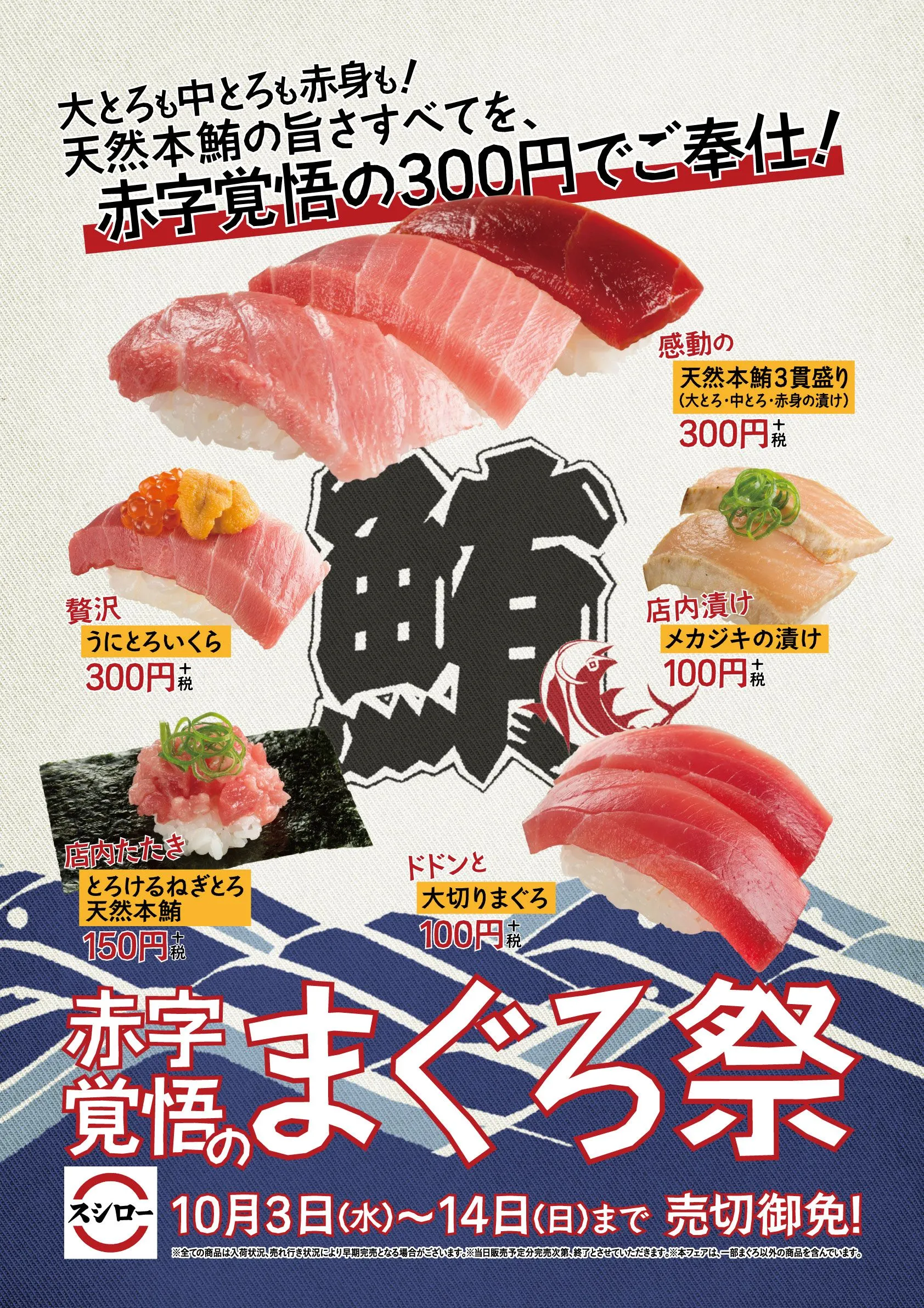 株式会社あきんどスシロー(本社:大阪府吹田市、代表取締役社長:水留 浩一)は、10月3日(水)より『まぐろ祭』を開催いたします。