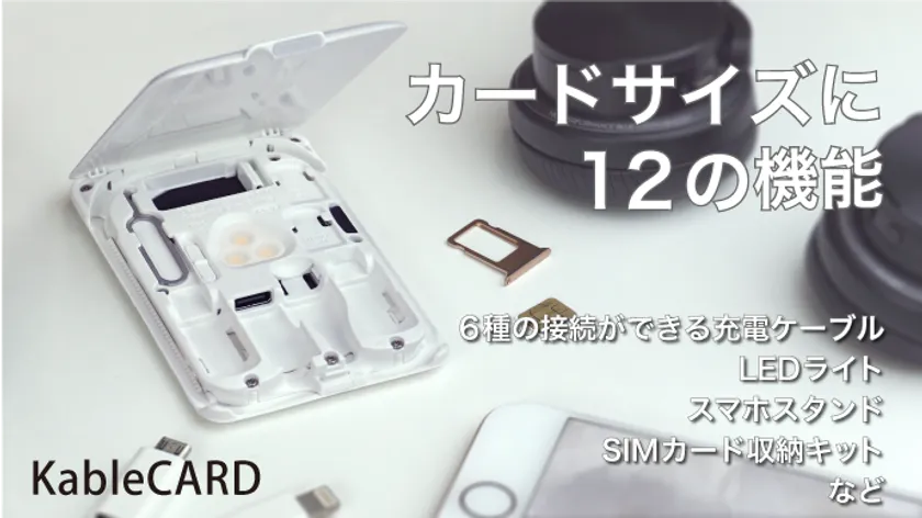 KableCARDは、カードサイズに6種類の充電ケーブルやLEDライト、SIMカード収納など、12の機能を搭載したスマートフォンやガジェットに最適な小型マルチツールです。一般発売に先がけ、プレマーケティングを兼ねた支援調達をMakuakeで実施。先着順、数量限定にて早期支援者にお得なディスカウントプランも用意しました。
