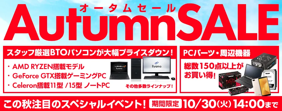『オータムセール』では、スタッフ厳選のBTOパソコンを大幅プライスダウン! AMD(R) Ryzen(TM)搭載モデルやGeForce(R) GTX搭載ゲーミングPC、インテル(R) Celeron(R)プロセッサー搭載の11型・15型ノートパソコンなど、セール対象パソコンをお得な価格でお求めいただけます。もちろん、自作ユーザーにおすすめのPCパーツや周辺機器も多数ご用意いたしました。