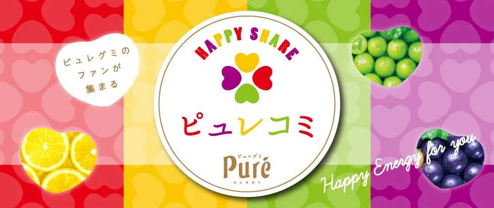 「ピュレコミ」では、”先行モニター新商品お試しピュレゼンター” “なんでもピュレ・レビュー”をはじめ、ピュレグミファンとグミを楽しむ様々な企画を実施しております。https://www.kanro.jp/kanro/pure/