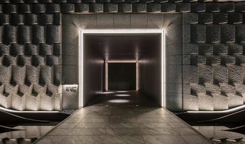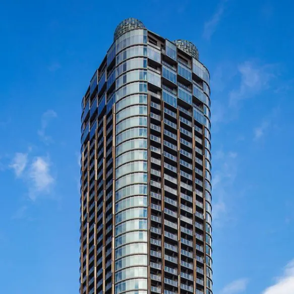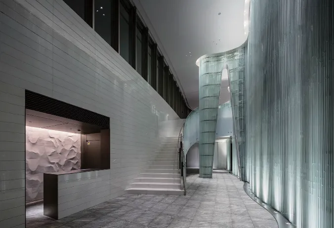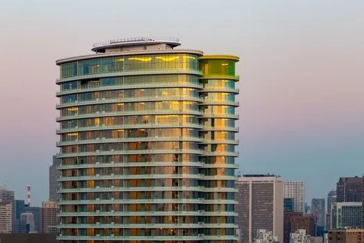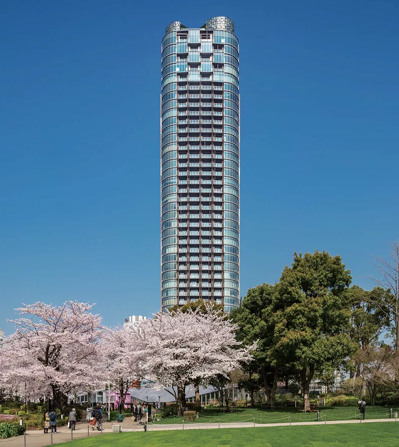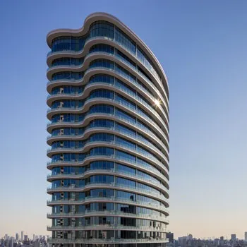 美しいカーブを外観にもつタワー型マンション。都市のシンボルとして、カーブを描く外観形状が、様々な時間や方角から異なる顔をみせており、都市の風景と有機的に呼応している。エントランスに作られたドレープのようなガラスのデザインワークも秀逸である。