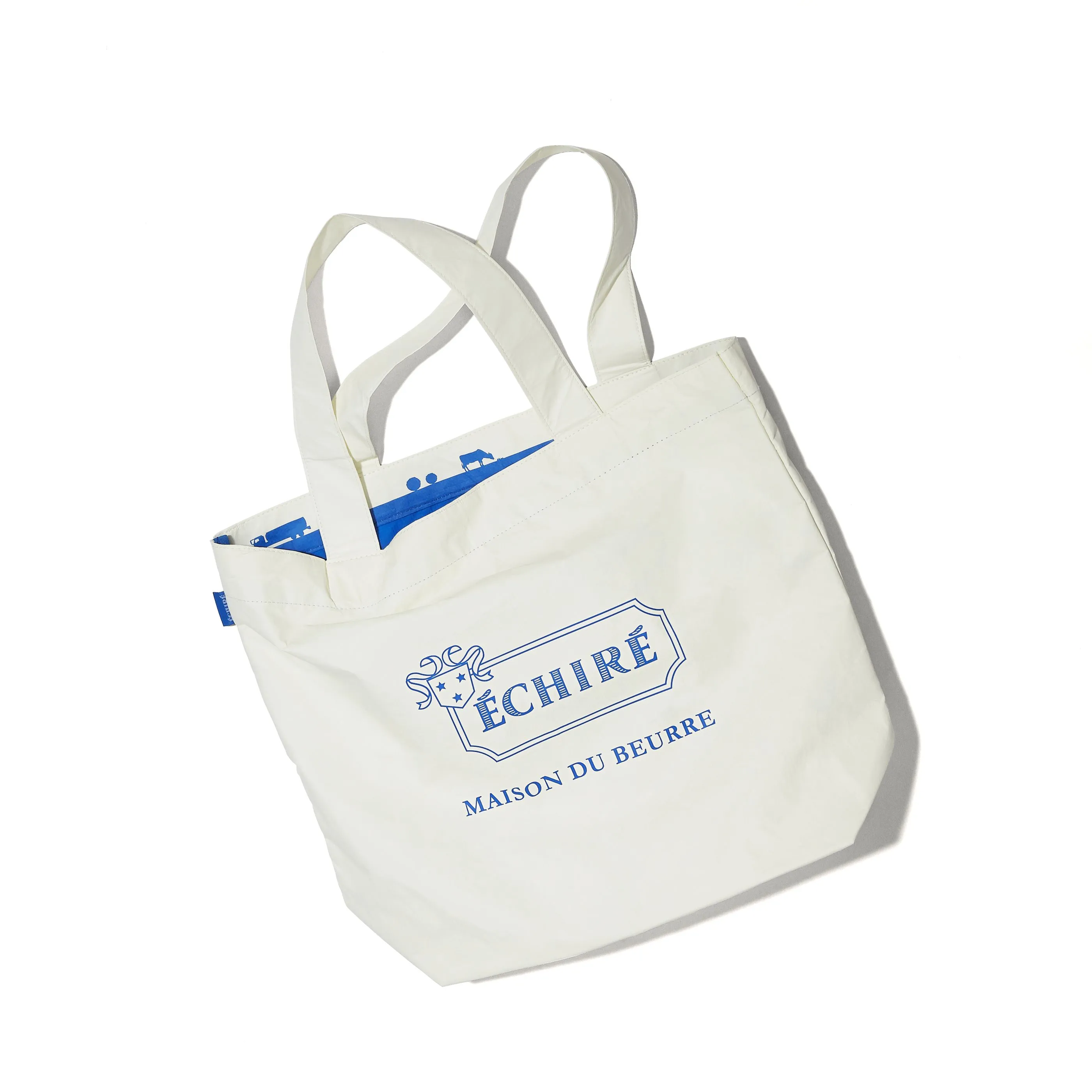 エシレ・メゾン デュ ブール限定、オリジナルのポケッタブルトートです。白地にブルーのさわやかなカラーで「エシレ」のロゴと「E(Eの上にアクサンテギュ)」のロゴを片面ずつプリント。内側には、フランス・エシレ村で放牧されている牛たちをデザインし、エシレらしさを表現しています。サイズも大きくマチ付きで、収納力もバッチリ!持ち手も長いので、肩掛けも可能です。内側についた大き目のポケットにバッグ全体をたたんでコンパクトに収納できるのでサブ バッグとしてもお使いいただけます。さらにこのポケッタブルトートは、デュポン タイベックと呼ばれる、紙のように軽く耐久性と強度をもち、水にも強い高密度ポリエチレンの不織布を使用。丈夫で使い勝手もよく、ショッピング バッグとしてはもちろん、アウトドアやジムなどの荷物を入れるのにもおすすめです。