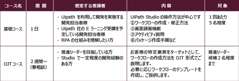 本トレーニングサービスは、RPAツール「UiPath」の基本的な動きや操作方法をハンズオン形式で学べる初心者向けのカリキュラムを企業ごとにご提供するもので、UiPathを導入・利用中、または今後導入・利用を検討されている企業のご担当者様向けのサービスとなります。また、「推進リーダー」を支援する問い合わせサービスとして「テクニカル・サポート」も提供しています。