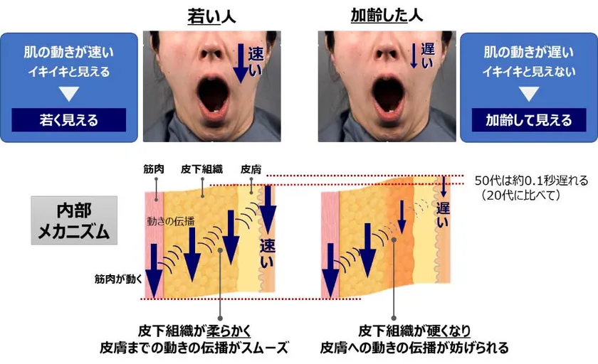 20~60代の女性が表情を変える際の動きを動画と静止画で用意し、一般モニターがそれぞれの年齢印象を評価したところ、40代の顔を境に、動いている顔の方が年配に見えるという結果が判明しました。そこで、モーションキャプチャーを用いて肌の動き方の年齢変化を調べたところ、表情をつくる際のごくわずかな肌の動きの遅れをエイジングサインとして感じ取っていることが示唆されました。この「遅れ」は、皮膚組織の上層が硬くなり筋肉の動きが皮膚表面に伝わりにくく、肌が顔の動きに追いつけなくなっていることが原因であると分かりました。この研究で得た知見は、今後の商品サービスに応用されます。