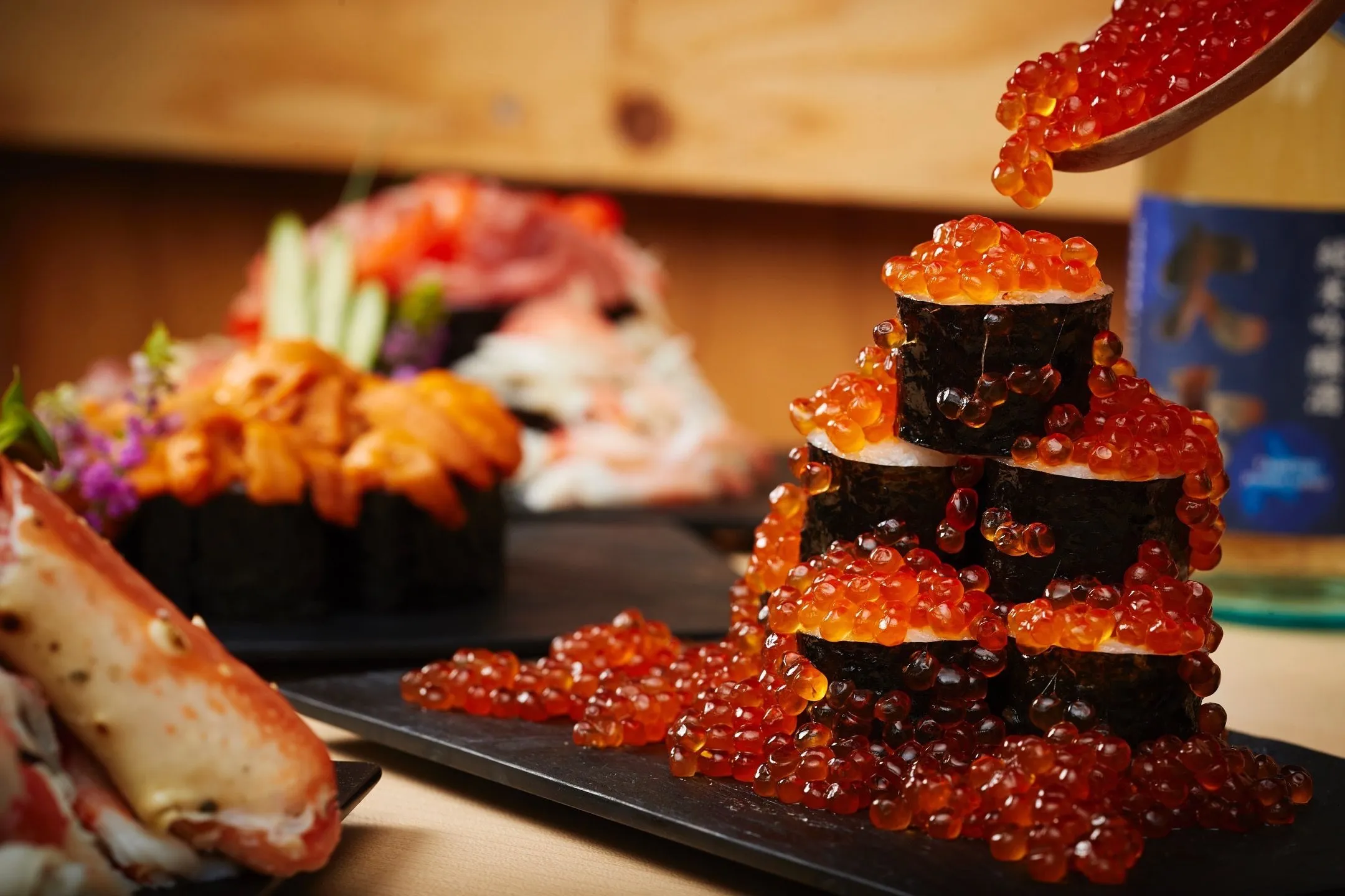 こぼれ寿司に使用する海鮮は、主にイクラ、カニ、マグロ、ウニです。冬に食べられるカニは、流氷とともに訪れるプランクトンが豊富な海域で育つため身が詰まると言われ、マグロは脂ののった魚介を餌とし、上質な脂がのって味わいが増すと言われています。このような海鮮がこぼれるぐらいに盛り付けられたこぼれ寿司を堪能することで、笑顔もこぼれるような体験をしていただきたいと願っています。