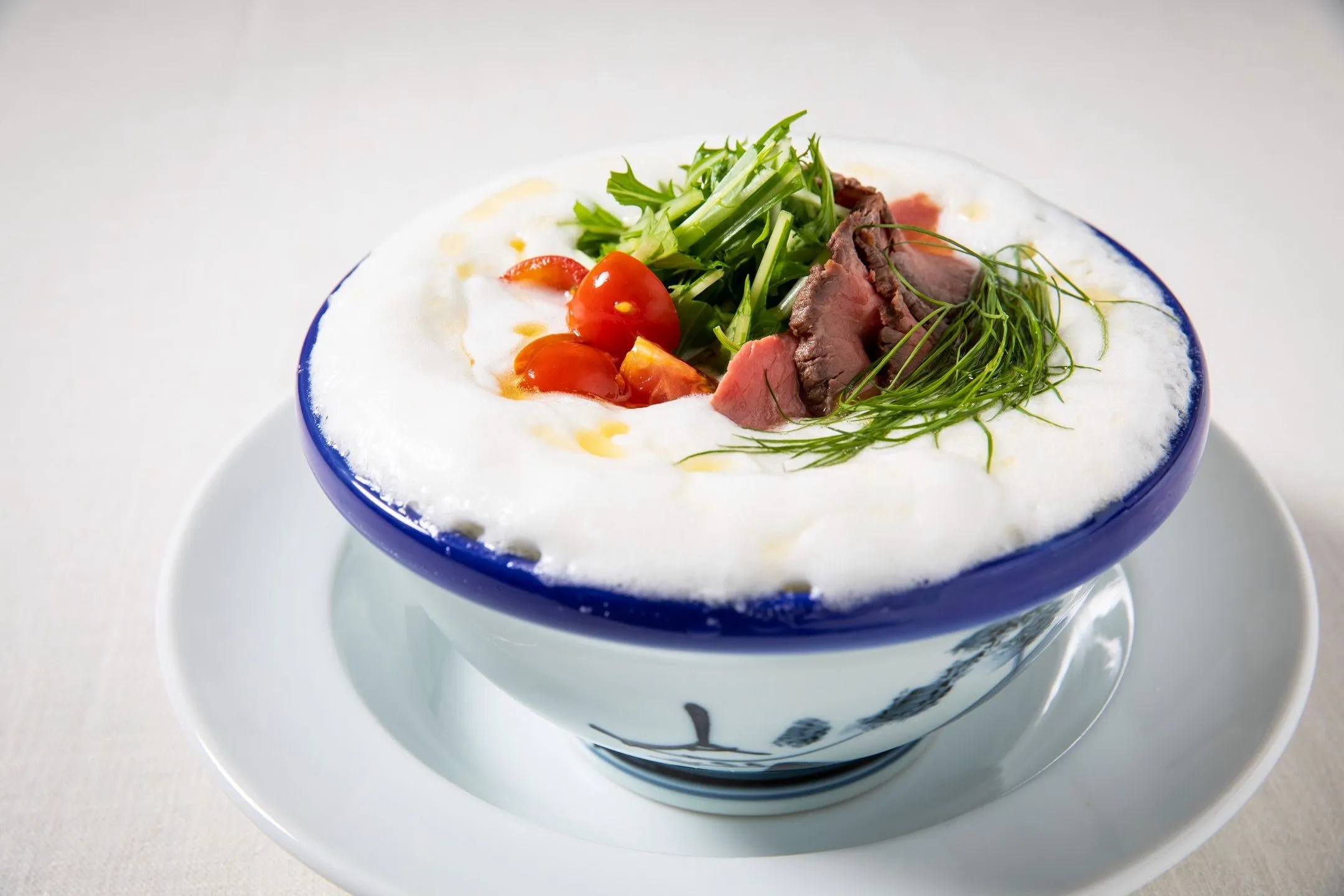 口当たり滑らかな絹ごし豚骨スープのらーめんに、ふんわり柔らかな特製メレンゲを溢れんばかりに添えた一品です。