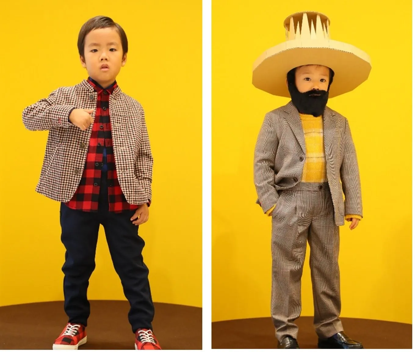 チェックのセットアップにハロウィンカラーのイエローを差し色にしたコーディネート。イエローのチェックニット×イエローのチェックシャツを合わせて小生意気風に。トップスを変えれば七五三やレストランでのお食事会にも最適です。