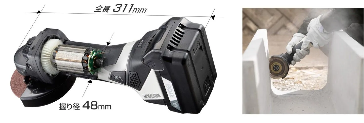 小型で高出力のブラシレス分割コアモーターにより、従来モデルに比べ出力を60%向上し負荷の高いコンクリートなどの切断作業においても、よりストレスなく行えます。全長は、18Vクラスで最も短い311mmと、本体をしっかり保持できる握り径48mmの細いボディを実現。これらにより、現場での作業性向上に貢献します。