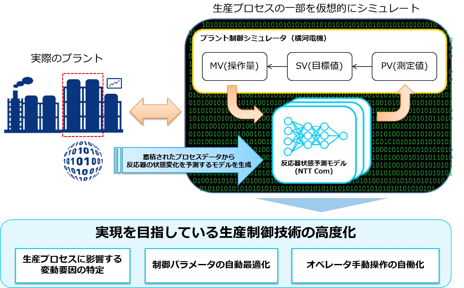 NTTコミュニケーションズ株式会社(本社:東京都千代田区、代表取締役社長:庄司 哲也、以下 NTT Com)は、横河電機株式会社(本社:東京都武蔵野市、代表取締役社長:西島 剛志、以下 横河電機)、および横河ソリューションサービス株式会社(本社:東京都武蔵野市、代表取締役社長:村井 哲也、以下 横河ソリューションサービス)と、各社のAI/IoT技術を連携させることで、プラント内の反応器の状態を予測するモデル(反応器状態予測モデル)を構築し、そのモデルを横河電機のプラント制御シミュレータ※1と組み合わせ、仮想的にプラントを再現するために必要なシミュレータを構築した結果、予測誤差の累積による乖離を起こすことなく、連続的にシミュレータを実行することに成功しました。その結果、状態変化に影響を与える各要素の影響度を分析できるようになりました。