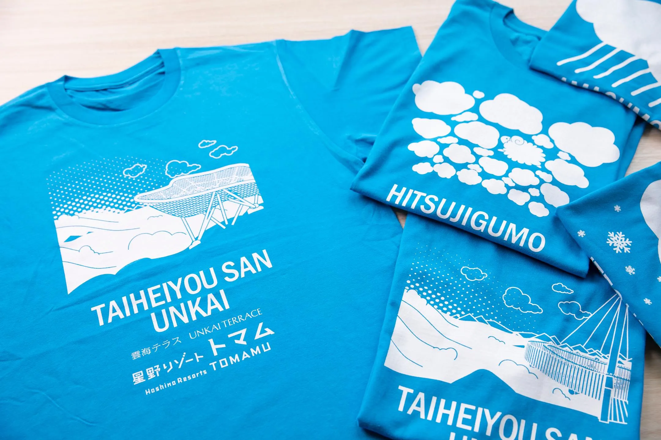 100万人になぞらえ、当テラスから眺められる雲海や雲をテーマにした、100種類のオリジナルTシャツ1,000枚を来場したお客様にプレゼントしました。「太平洋産雲海」をイメージしたTシャツは、展望スポット「CloudPool(クラウドプール)」と一緒に雲海が描かれています。また、「ひつじ雲」をイメージしたTシャツは、本物のひつじがひつじ雲に混ざっている点が特徴です。