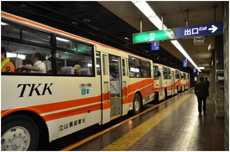 室堂駅のホームで発車を待つ、トロリーバス。1便につき最大3両にて運行される。
