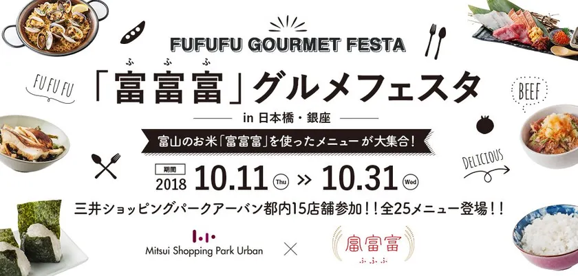 今秋デビュー!富山米の新品種「富富富(ふふふ)」の美味しさを体感しよう。 銀座・日本橋室町の15店の飲食店で「富富富」を使ったメニューを 期間限定でお届けいたします。 開催期間:2018年10月11日(木)~10月31日(水)