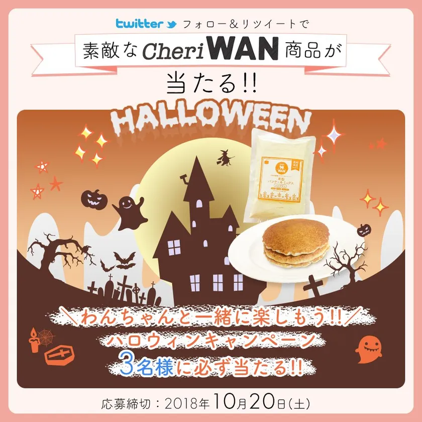 TwitterでCheri WAN公式アカウント( @cheri_wan )をフォローし、2018年10月1日(月)にCheri WAN公式アカウントが投稿したキャンペーンツイートをリツイートしてくれた方の中から、抽選で3名様に「Cheri WAN米粉パンケーキミックス(パンプキン)」をプレゼント。