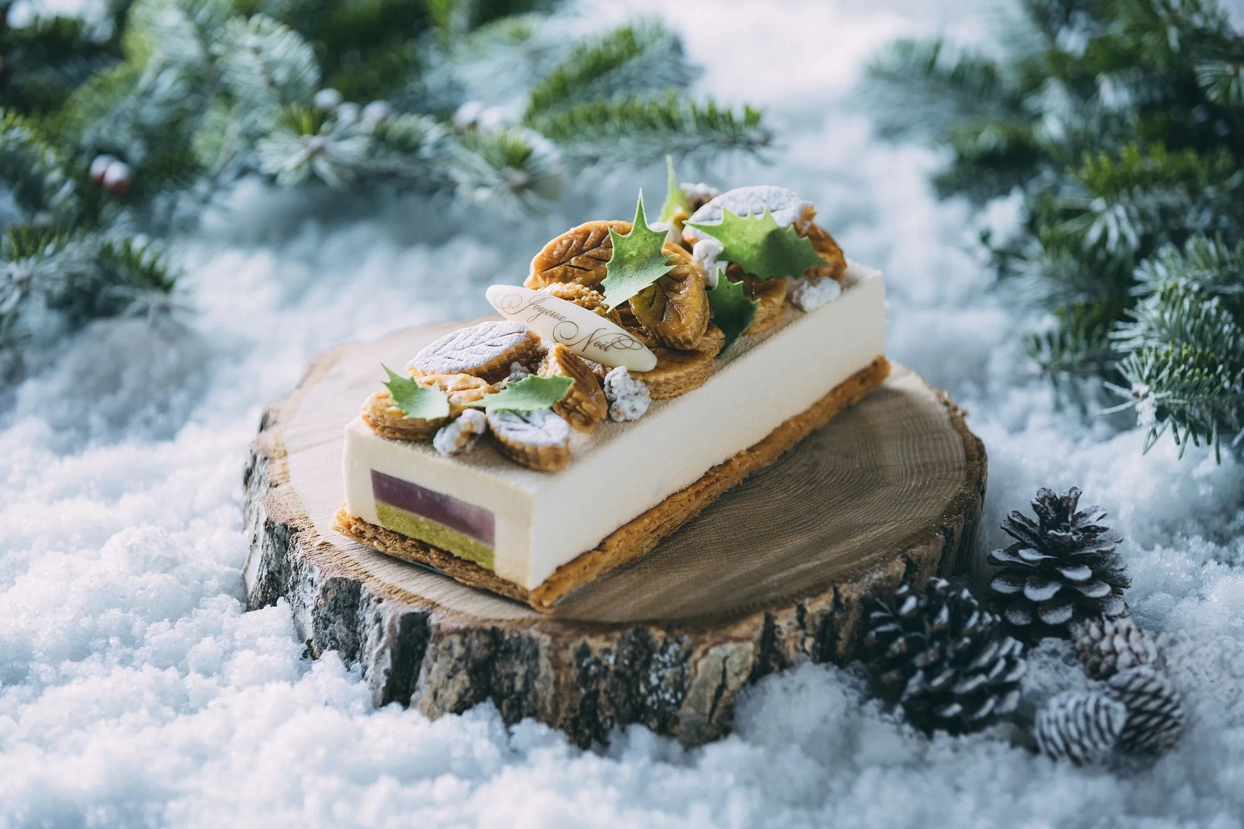 クリスマスケーキの今年の新作は、キャラメルの香ばしい甘さが特徴のアップルパイです。世の中の市場にはまだあまり出回っていない、赤い果肉が特徴のリンゴを使っています。このリンゴをコンポートとジュレにした層に、ピスタチオと胡桃を合わせた層を重ね、キャラメルのムースで包みました。キャラメルをからめた葉の形のパイ生地は、森の落ち葉を表し、軽井沢の冬の森を思わせます。