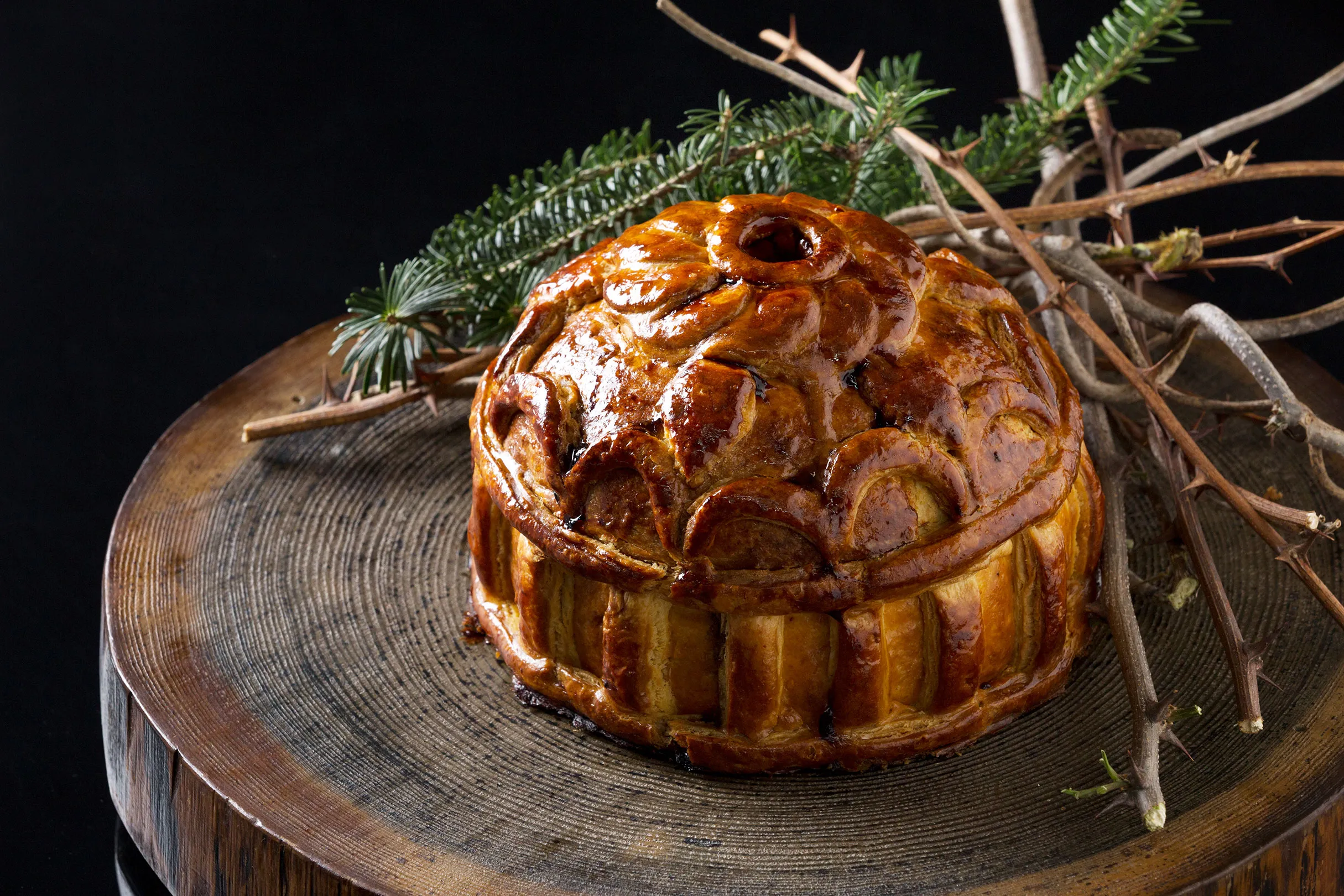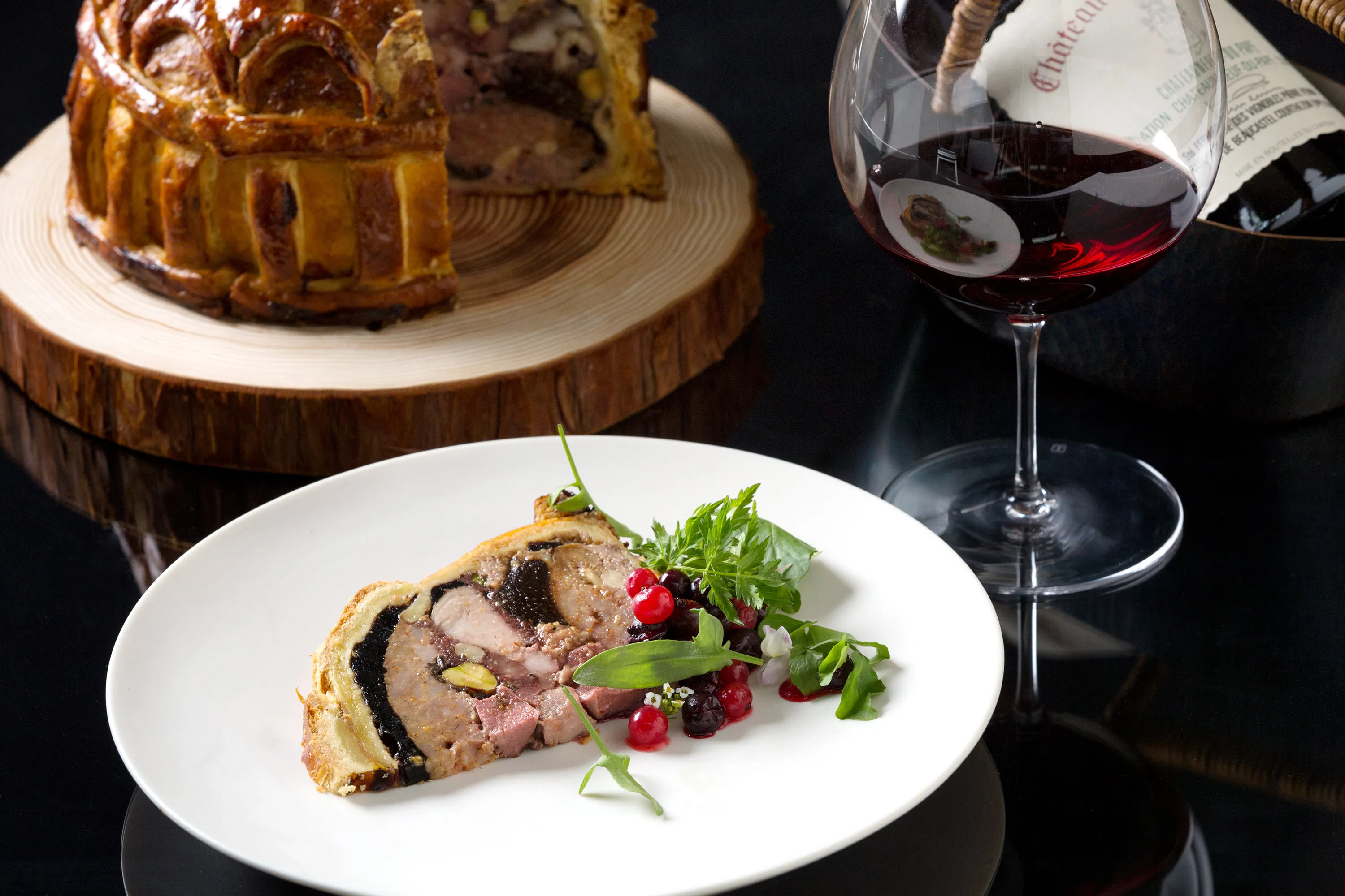 「パテ・ド・ロワ」は古典フランス料理の前菜で、鹿や猪、山鳩など4種類以上のジビエ、トリュフ、フォアグラ、フルーツなどの食材ををミンチ状にし、パイ生地で包んで約2時間焼きあげた料理です。王様の冠のような大きな形のままテーブルへサーブし、ゲストの目の前で切り分けます。