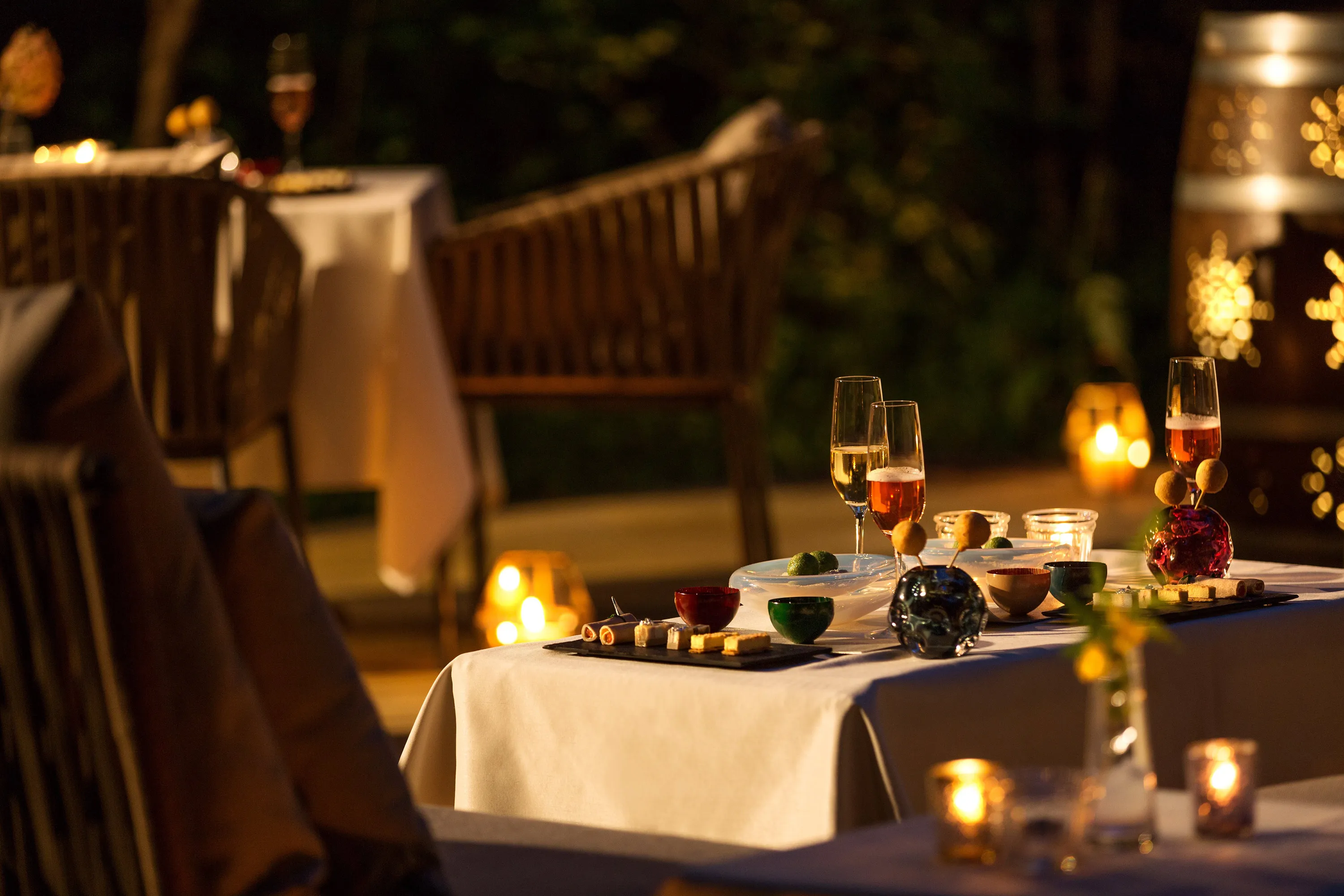 「王様のジビエ」は、カクテルとジビエを味わう「焚き火アペロ」(アペロとは食事の前にお酒を楽しむこと。食前酒=アペリティフの略語)から始まります。凛とした澄んだ空気の中、夜空には美しい星々が瞬きます。薪のはぜる音を聞き、揺らめく炎を見つめながらお酒を楽しむひとときは、冬の軽井沢ならではの優雅な楽しみです。