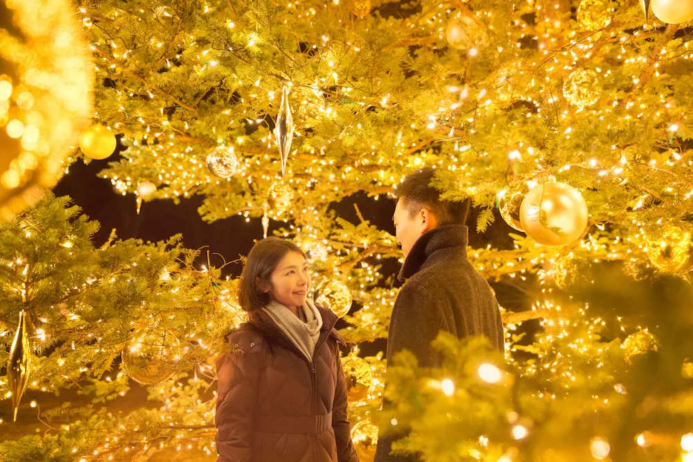「もみの木広場」には、クリスマスタウン軽井沢のシンボルツリーとして、高さ10メートルの本物のもみの木が飾られます。満天の星の下、森の木々に囲まれてツリーがきらめき、ツリーの枝と枝の間に立つと、星屑の中に紛れ込んだような、キラキラとした写真が撮れます。(シンボルツリーは、クリスマスタウン軽井沢開催中、毎日点灯します。)