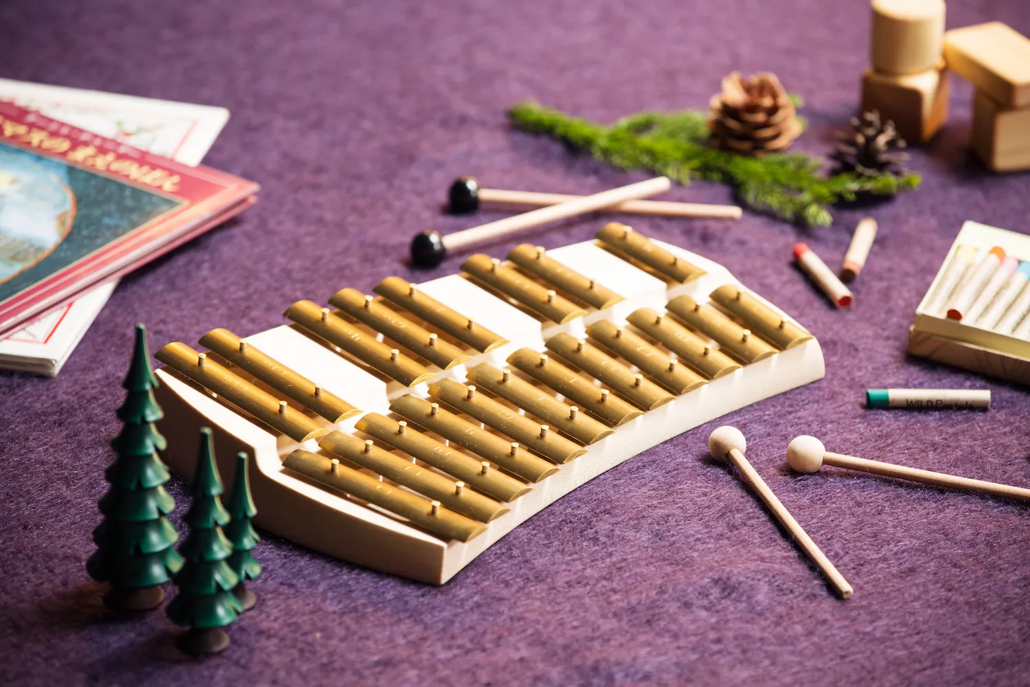 ハンドメイドの木製クリスマスツリー、積み木、小さな木琴、木製のカトラリーなどが並びます。素材が持つ温かみを感じられるのが特徴で、小さなお子様へのプレゼントにおすすめです。