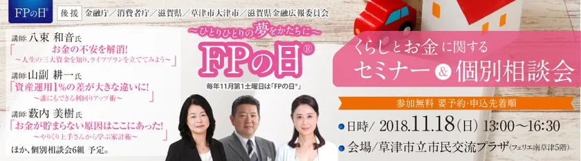 「NPO法人日本FP協会(正式名称:特定非営利活動法人 日本ファイナンシャル・プランナーズ協会)」は、11月第一土曜日の「FPの日(R)」にちなみ、滋賀支部では、11月18日(日)に参加無料のセミナー・相談会「FPフォーラム in 滋賀」を、JR南草津駅前にて開催します。今年は、セミナーの講師に八束 和音氏、山副 耕一氏、薮内 美樹氏を迎え、ライフプランの考え方や、具体的な投資方法、お金を貯める方法など、具体的な事例を元にお話いたします。
