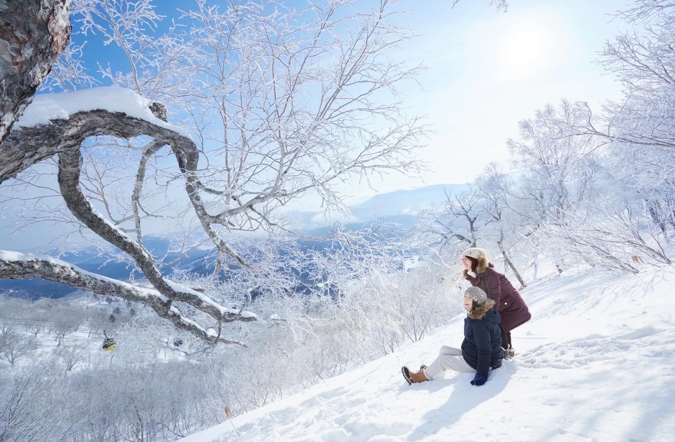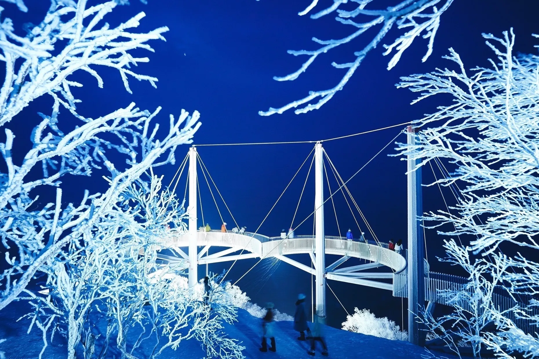 この冬からは、クラウドウォークやそこまでの道のりをライトアップするので、霧氷の木々に囲まれた道を歩き、その先で360度に広がる霧氷に囲まれて過ごせます。霧氷がライトに照らされてきらきらと輝く景色は、夜にしか見られません。加えて、ダイヤモンドダストという、空気中の水蒸気が凍る現象も見られる場合があります。また、霧氷テラスまでは往復ともゴンドラに乗り約13分でアクセスできるため、夜でも安心して絶景を楽しめます。