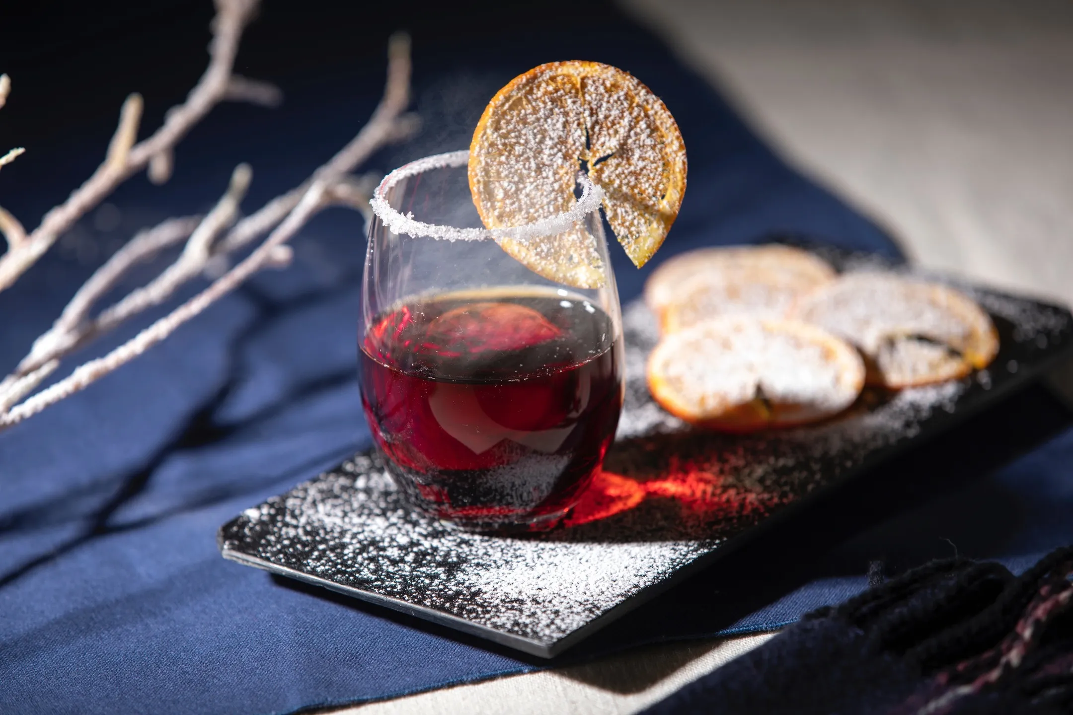 霧氷テラスでは、「霧氷ホットカンパリ」というオリジナルドリンクを提供します。氷点下の気温になる冬山でも身体を温めながら絶景を楽しんでいただけるよう、温めると香りが引き立つカンパリにオレンジジュースを入れてアレンジしました。また、木々に付く霧氷をイメージしてグラスのふちに砂糖をまぶし、粉砂糖を振りかけた輪切りのオレンジを添えています。