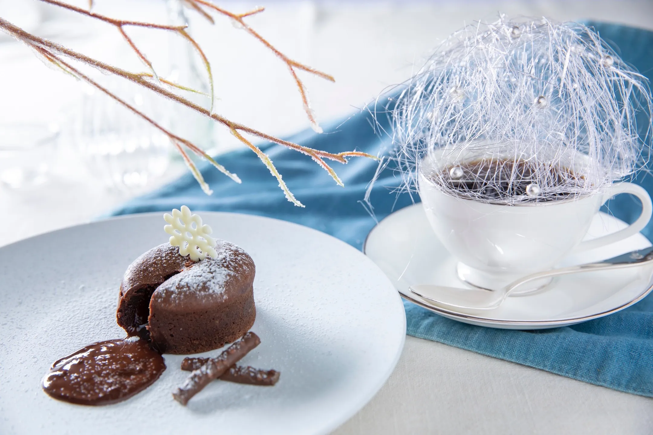 霧氷テラスでは目の前に広がる霧氷の絶景を眺めながら、「霧氷フォンダンショコラ」と、「霧氷コーヒー」を楽しめます。霧氷フォンダンショコラは、温かいフォンダンショコラに雪の結晶の形をしたホワイトチョコレートと枝につく霧氷を表現した枝チョコを添えた一品です。霧氷コーヒーは、霧氷をイメージした真っ白な飴細工を添えたホットコーヒーです。溶けていく霧氷のように飴細工をコーヒーに溶かし、ほんのり甘いコーヒーを味わえます。*数量限定