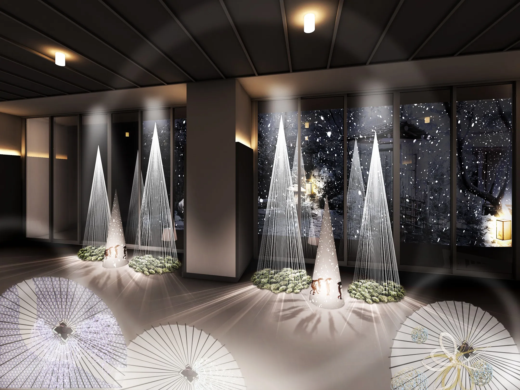 雪吊りは、北陸地方特有の重い雪から木を守るために、木の先端から縄を放射線状に張る手法で、雪吊りが並ぶ様子は、北陸の冬を象徴する景色として人気です。界加賀では、加賀の希少伝統工芸である加賀水引を使い、美しい雪吊りの風景を表現した館内装飾「加賀水引の雪吊り」が登場します。