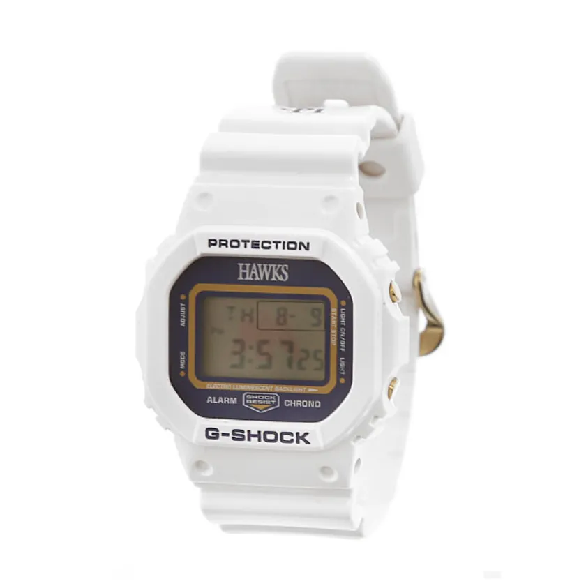 G-SHOCKの原点であるスクエアケースを採用した「DW-5600」に南海ホークスの鷹マークが浮かび上がるELバックライトを搭載したモデルDW-5600E-1をベースに、勝利をイメージさせるゴールドIPの尾錠とボタンなど、球団創設80周年記念にふさわしい特別仕様で仕上げたコラボモデルです。裏蓋には福岡ソフトバンクホークスのロゴを刻印、コーディネートしやすいホワイトカラーの光沢樹脂ボディ。ホークス球団創設80周年ロゴマークをあしらった、専用デザインの缶パッケージでお届けいたします。