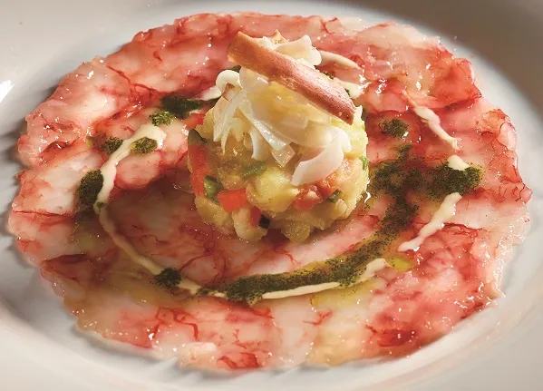 赤海老のカルパッチョ(イカとインゲンとジャガイモのサラダ、マグロのカラスミのマヨネーズ添え)