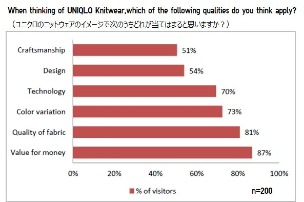 また、ユニクロニットを思い浮かべた時に当てはまるイメージでは、「プライスバリュー」が87%、「高品質」が81%と回答し、フリーコメントでも「こんなに高い品質を提供しているのに対して、低価格であることに驚きました。」といった回答が多く、高品質、高い価値といったLifeWearの特長が伝わる展示会となりました。